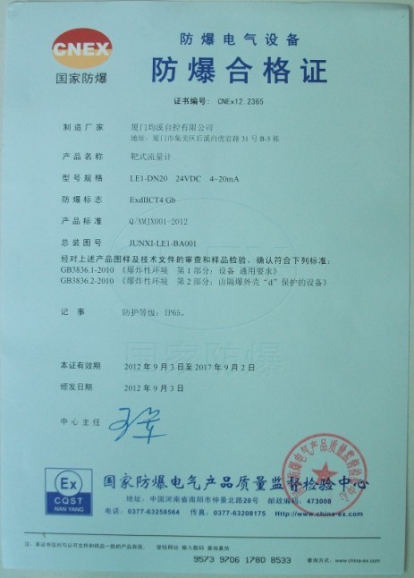 靶式流量計(jì)隔爆型防爆證